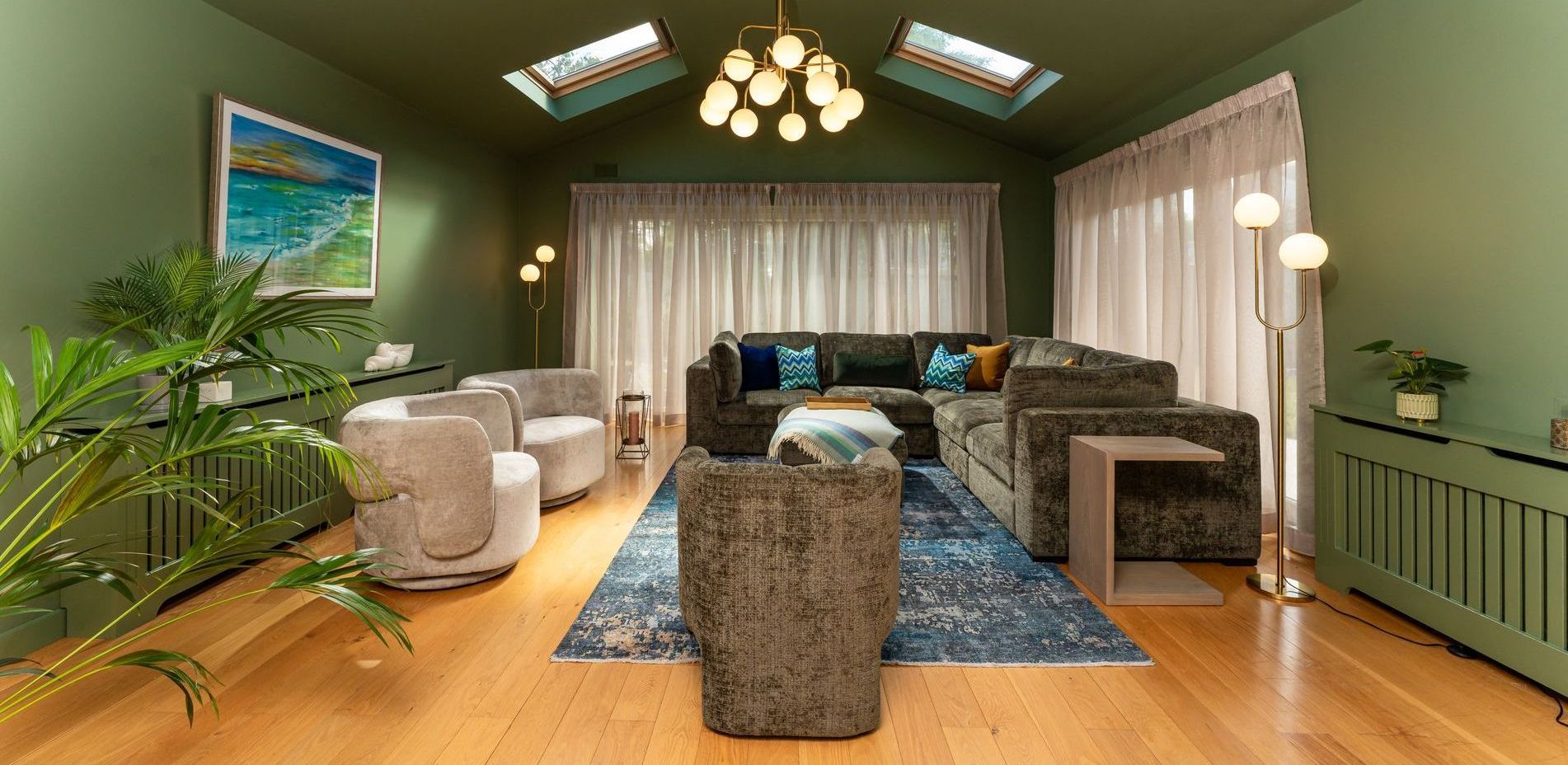 The goal was to create a warm and cosy family room where everyone could enjoy spending time together. The room is large, and the bright walls made it hard to achieve that cosy feeling. To solve this, we used deep, warm colours and added various textures. These choices help make the space inviting and comfortable, perfect for the whole family to relax and connect.