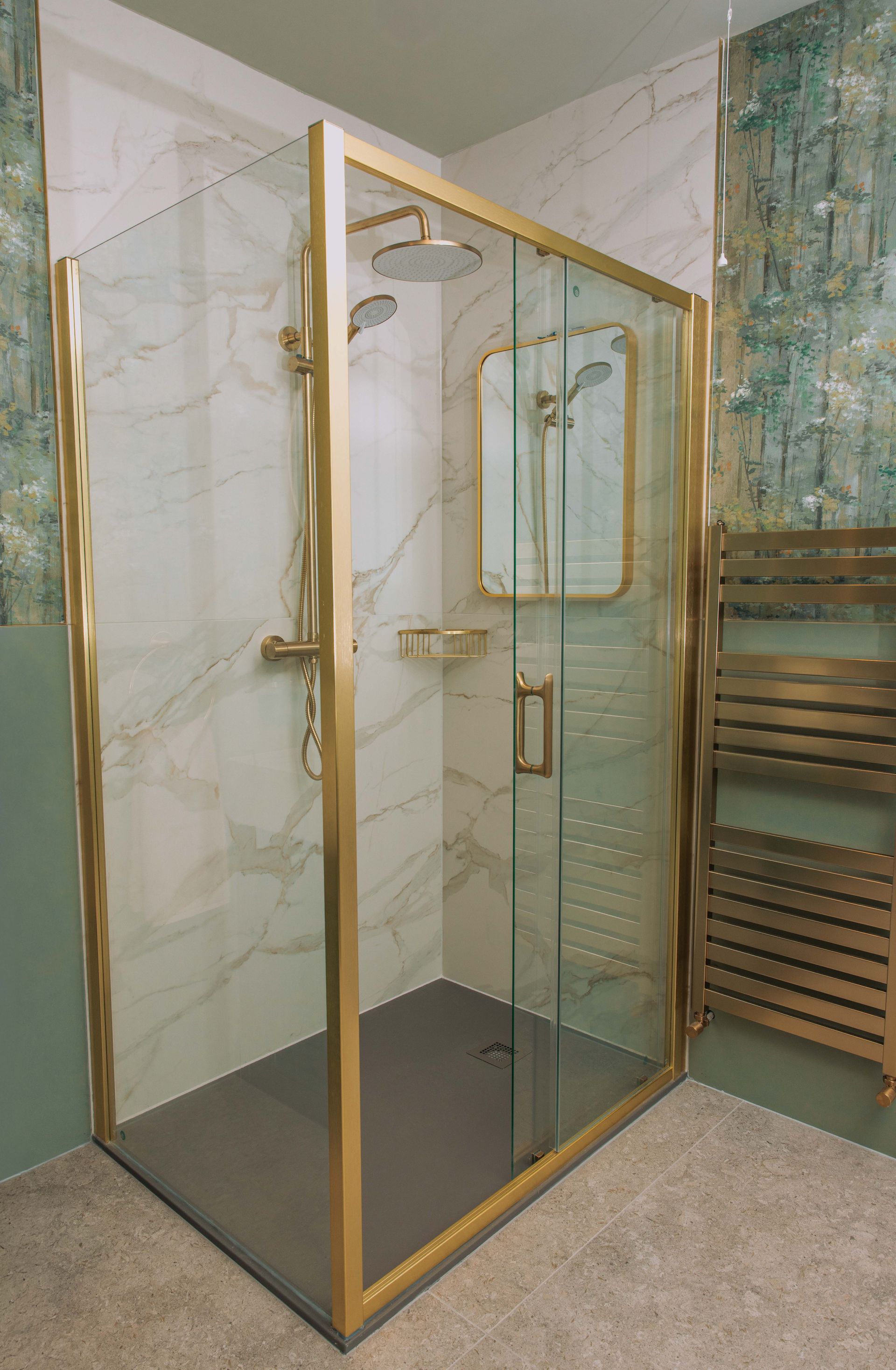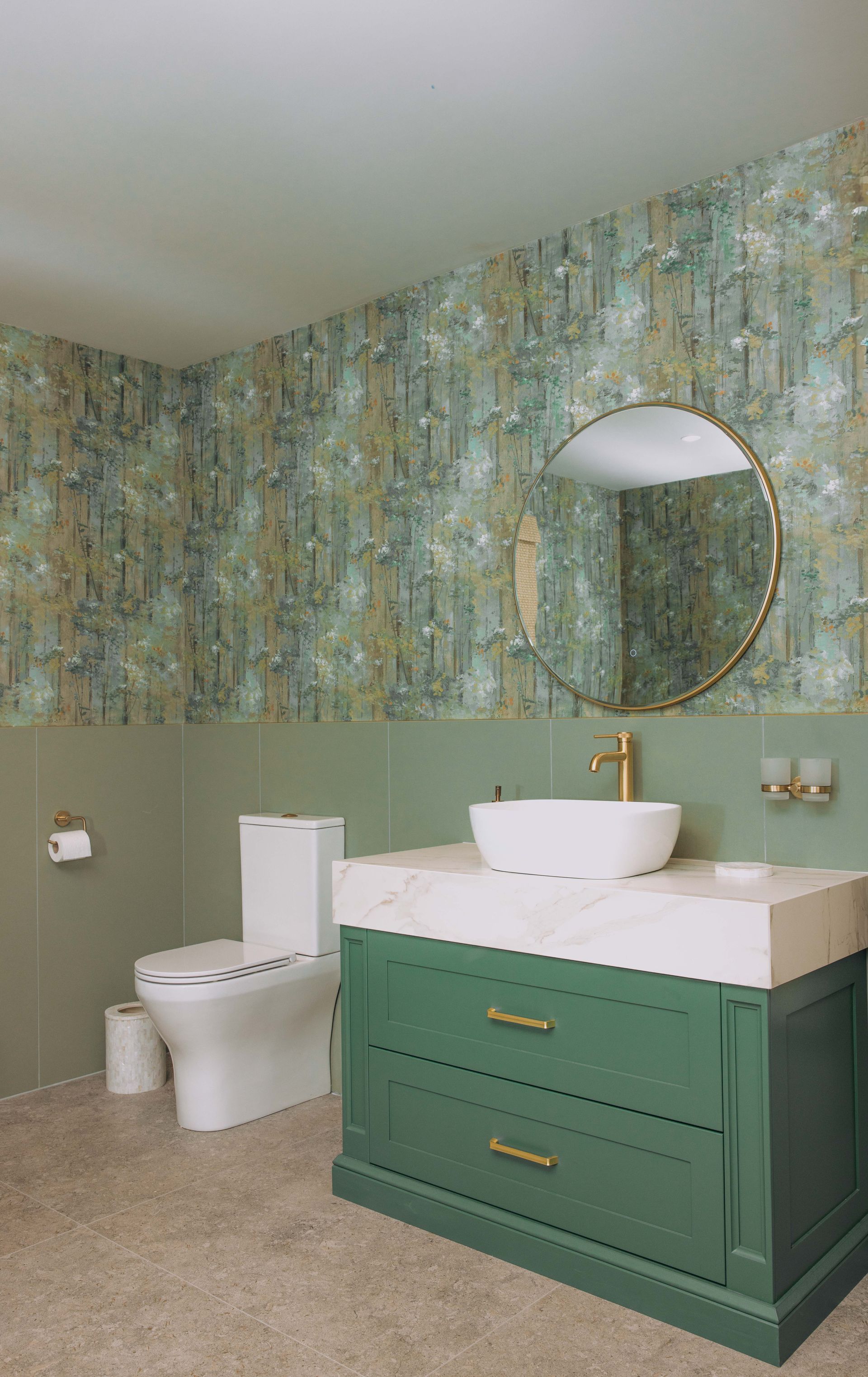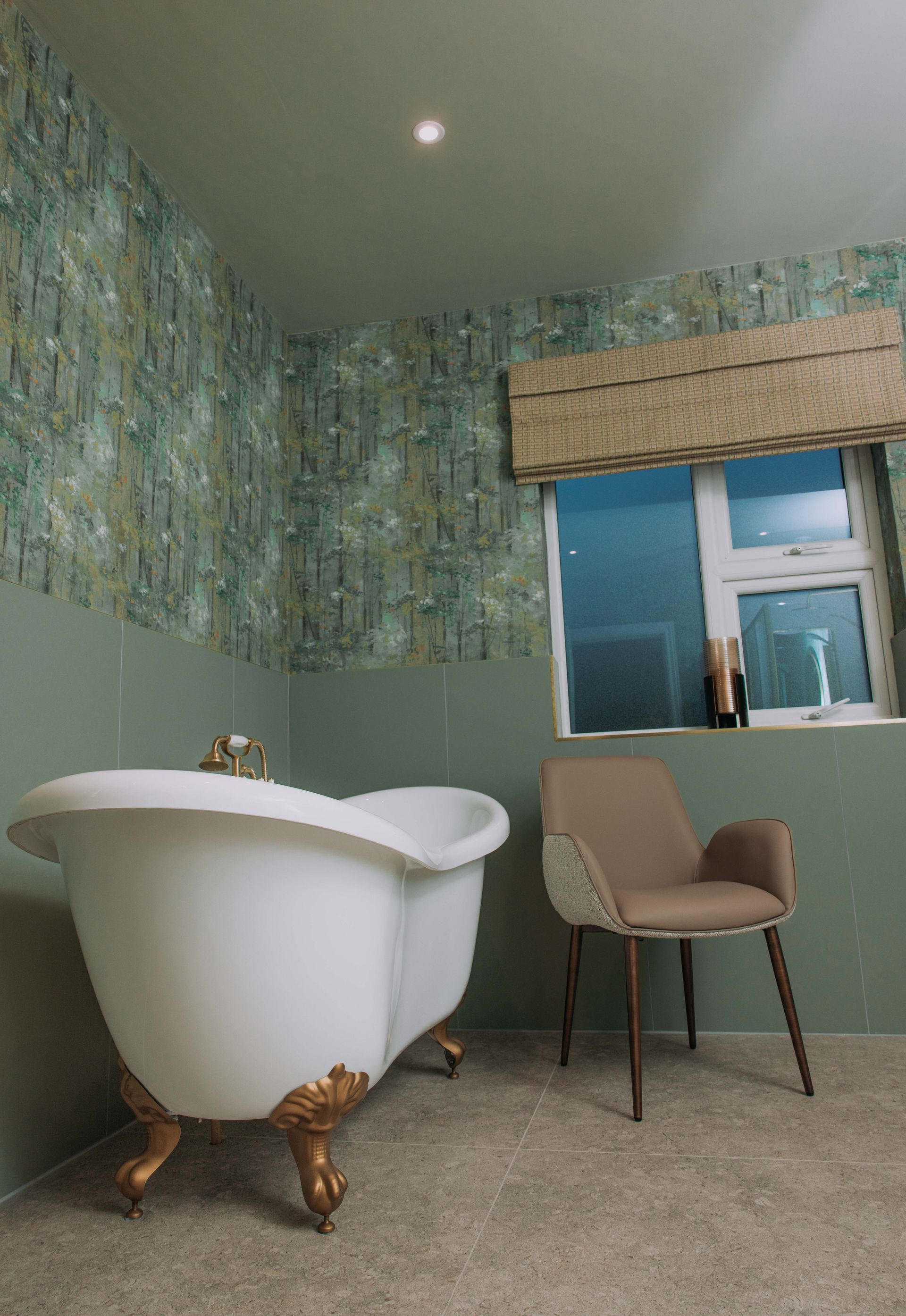 This bathroom blends comfort and style perfectly. Our clients wanted a luxurious, warm, and personal design with a wow factor, and this space delivers just that. The aim for this bathroom was to create a luxurious and unique space that is practical for everyday use while also providing a spa-like feeling. The walls are adorned with textured wallpaper in lovely green and nature-inspired patterns, creating a peaceful atmosphere. The colours make the space feel fresh and inviting.