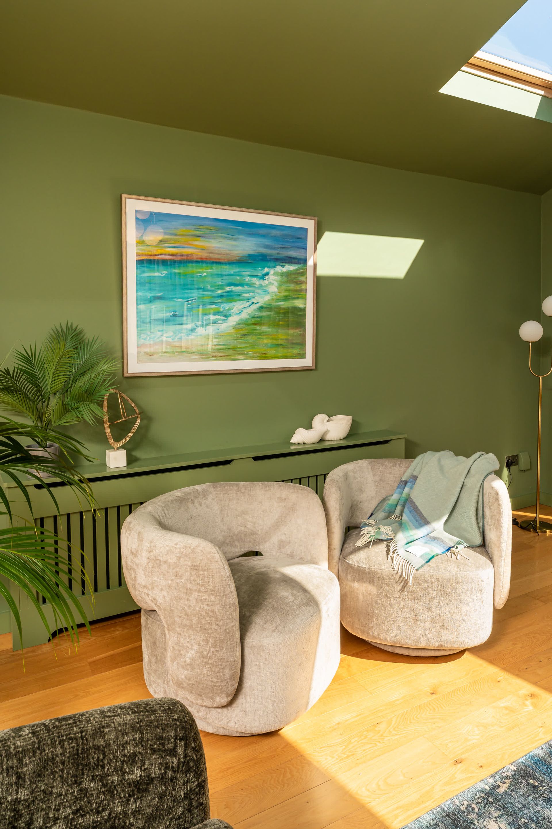 - Colour Palette: We embraced rich, deep tones for the walls, instantly creating a snug and inviting ambiance. These colours wrap around you like a warm hug, making the space feel alive and comforting. We also brought the outdoors in with a nature-inspired colour palette to create a sense of calmness and relaxation.
